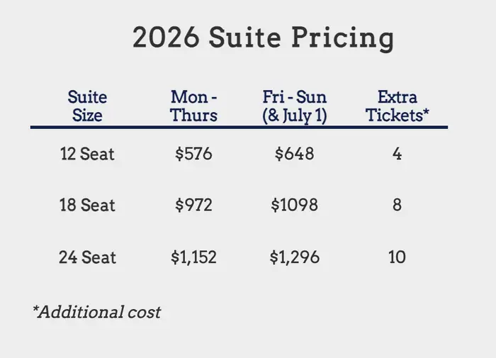 RE/MAX Field has 12, 18 and 24 seat suites with the option to purchase additional tickets based upon suite size. Extra suite tickets are available based on suite size at a cost of $30 per ticket. Outdoor seats for each suite are limited to the listed size of the suite (12, 18, and 24).