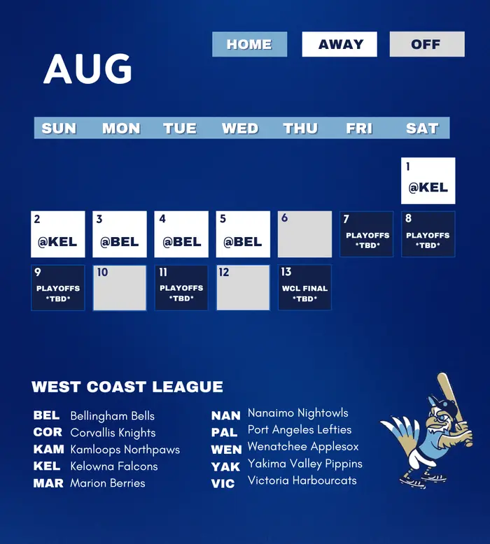 Then it’s a wild ride through June and July, loaded with Canadian rivalries and a must-watch rematch against the defending champs, the Bellingham Bells. You know we’ve got unfinished business there following last year's North Divisional Final matchup!